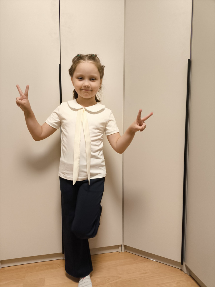 Приталенный силуэт подчёркивает фигуру и выглядит опрятно в составе школьной формы. Короткий рукав обеспечивает комфорт в помещении и в тёплое время года. Модель легко комбинируется с классическими юбками, сарафанами, брюками и жилетами, а также может стать основой праздничного наряда.
