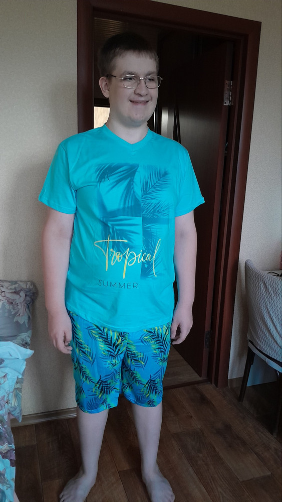 Мужской трикотажный костюм с шортами невероятно удобен, практичен и оригинален. Модель в ярких тонах станет удачным выбором для каждодневного аутфита. Такие летние костюмы из 100% натурального хлопка отлично подходят для пляжного сезона и для домашнего времяпрепровождения. Трикотажный костюм состоит из футболки свободного кроя с коротким рукавом, эластичная V-образная горловина которой обрабатывается под обтачку, и шорт. Удлинённые шорты с удобными боковыми карманами будут практичны и комфортны в любое время года. Необычным исполнением данной модели является авторский принт. Такой мужской костюм отлично подойдет для дома и отдыха, а также в качестве мужской пижамы, ведь состав - 100% натуральный дышащий хлопок.